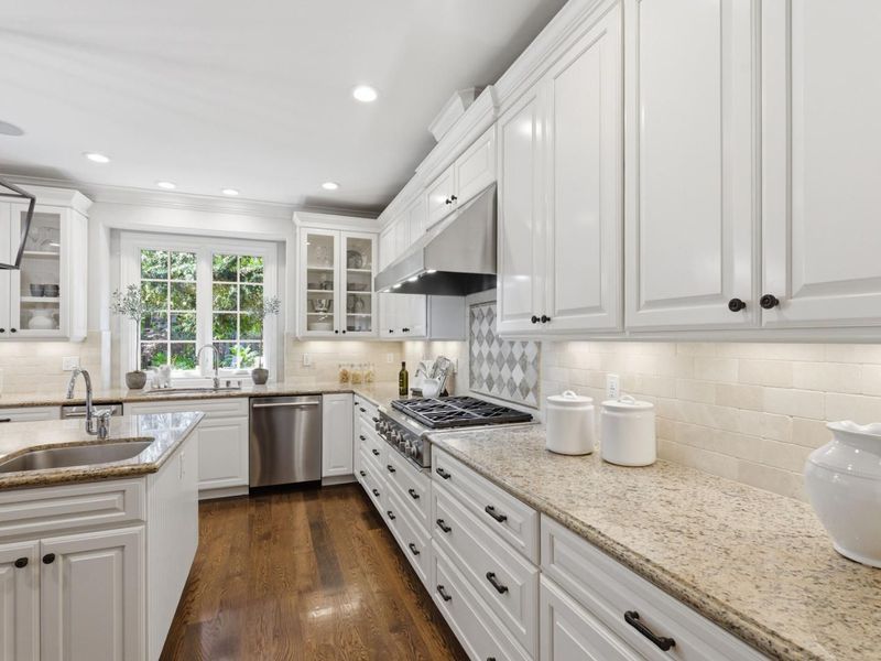 - Cooktop - Gas, Countertop - Granite, Dishwasher, Garbage Disposal, Hood Over Range, Ice Maker, Island with Sink, Microwave, Oven - Built-In, Oven - Self Cleaning, Pantry, Refrigerator, Trash Compactor, Warming Drawer, Wine Refrigerator