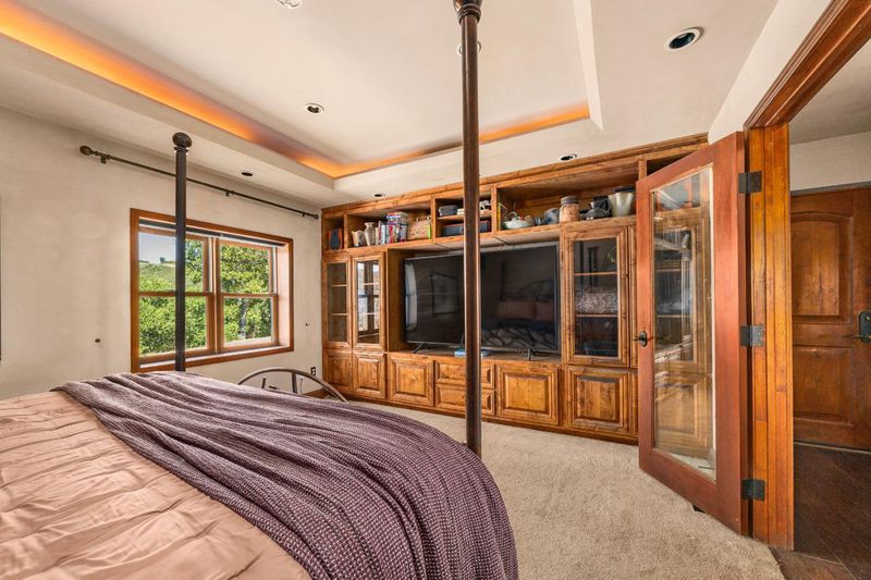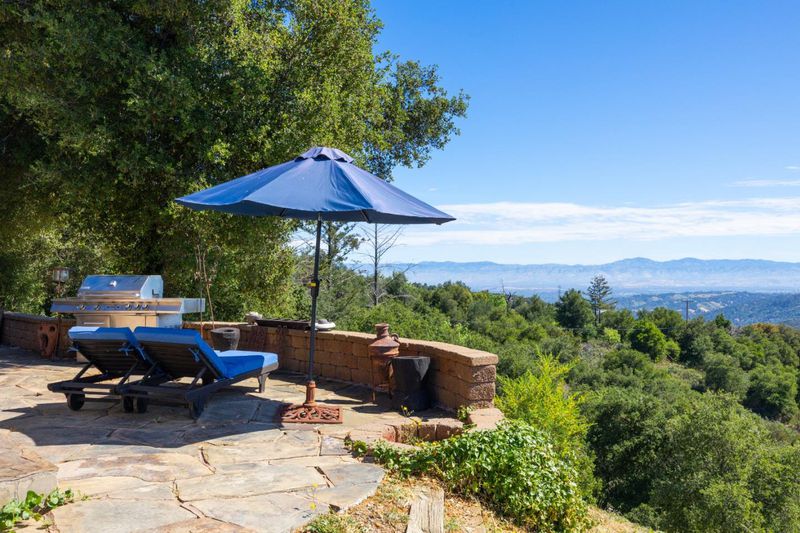 Perched above Montevina Road in the Los Gatos Mountains, this 15-acre gated estate offers privacy, scale, and panoramic views of the Bay Area, Lexington Reservoir, and Lyndon Canyon, just minutes from downtown Los Gatos. A paved road leads to a gated entrance, creating a private mountain retreat with dramatic sunrises and sunsets. The property includes an approximately 3 acre fenced area suitable for vineyard use, along with an additional 3 acres across the road offering potential for a second residence or expanded vineyard acreage. A high producing well is complemented by two 10,000 gallon storage tanks and an on site fire hydrant. The home features stone mosaic wall cladding, knotty pine cabinetry, solid core doors, hardwood floors, and a temperature controlled wine cellar finished in stone. The kitchen offers a stone island with seating, a chef quality six burner Jade range, and a Thermador oven. Two versatile outbuildings provide laundry and storage. Located within the Los Gatos School District, this is a rare opportunity to own a private, view-driven estate with close proximity to town!