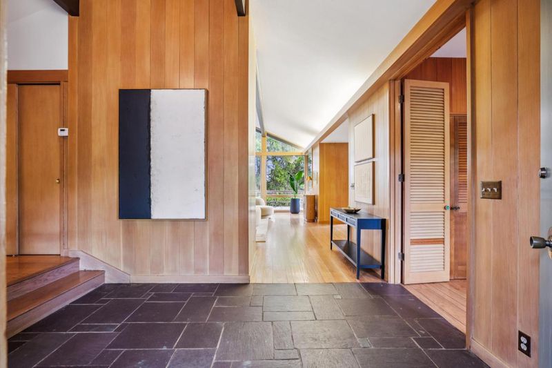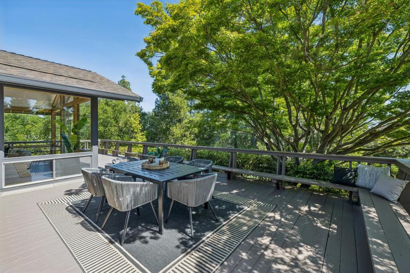 Defined by its connection to the landscape, this Los Altos Hills residence blends mid-century influence with expansive glass, warm wood detailing, and a floor plan that separates living and private spaces with purpose. Spanning 3,186 square feet on nearly an acre, the home is arranged with public gathering areas on one side and bedrooms on the other, creating a natural balance between openness and retreat. Inside, vaulted ceilings, rich wood paneling, and large windows frame tranquil tree views and bring in soft, natural light throughout the day. The kitchen, dining, and living spaces extend outward to a substantial deck with built-in seating, accompanied by a generously sized shaded patio just alongside, both ideal for entertaining. From here, steps lead down to a broad stretch of level lawn surrounded by mature landscaping, offering rare usable outdoor space with a true sense of privacy. The lower level adds flexibility with a spacious recreation room, guest suite, and additional storage. Well-placed at the end of a quiet cul-de-sac just minutes from town, the setting offers easy access to scenic walking routes through the hills, commute routes, and highly regarded Palo Alto schools.