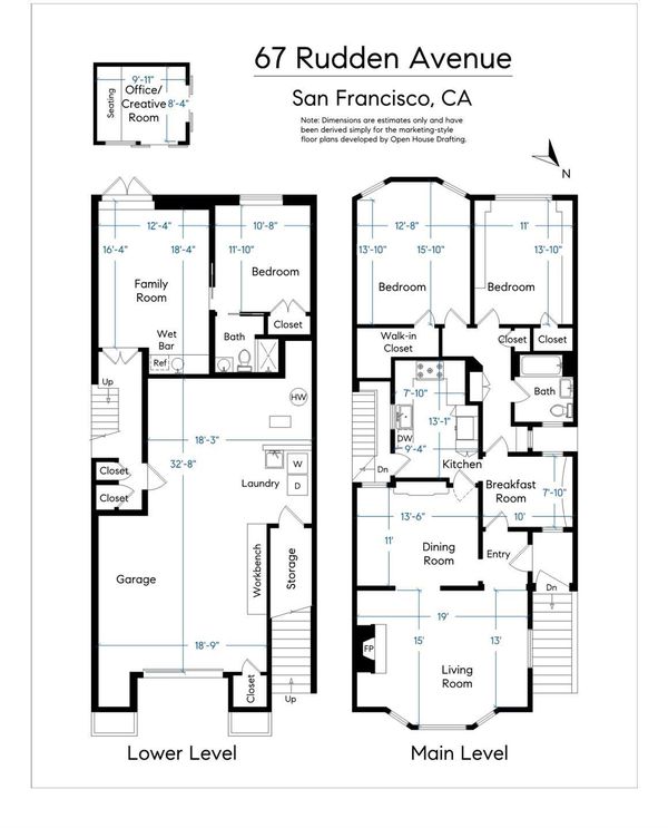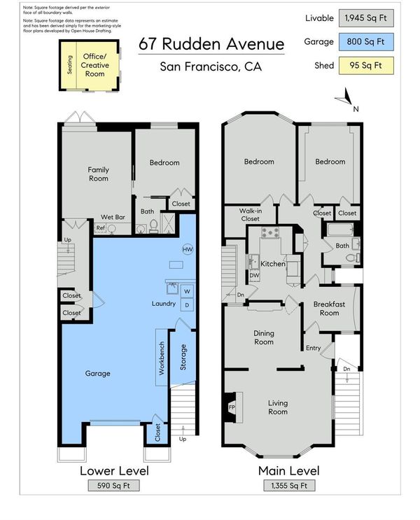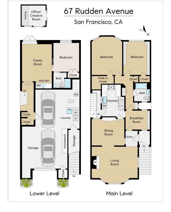 Classic Marina style elegance meets modern comfort at 67 Rudden Avenue. This beautifully remodeled Mission Terrace home offers a versatile two-level floor plan with timeless architectural details and inviting living spaces throughout. The main level features a spacious and light-filled living room, anchored by a classic center fireplace with elegant detailing, hill views, and beautiful parquet floors. Period charm and details continue with lovely moldings in the formal dining room accented by a built-in hutch and additional parquet floors. The beautiful and light-filled remodeled kitchen, with an adjoining breakfast room with custom built-in shelving, is ideal for both everyday living and effortless entertaining. Two spacious bedrooms are located in the rear of the home with outlooks to the beautiful garden. A tastefully renovated bathroom completes this level. The lower level expands the home's flexibility with a generous family room with a large wet bar/kitchenette, and a large primary with a full bath. The beautifully landscaped yard is accessed on this level and includes a detached bonus space, ideal as a home office, yoga studio, or creative escape. Two car parking.