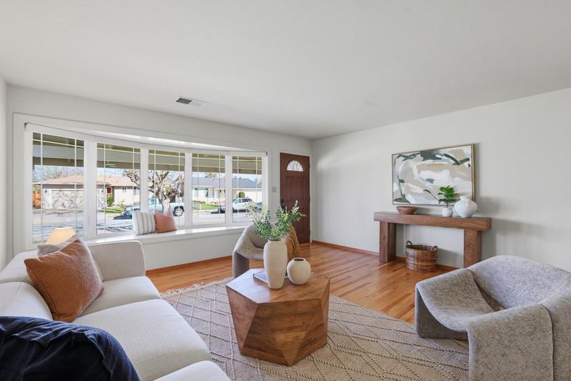 Well-maintained single-level home located on a tree-lined street in the highly desirable Happy Valley neighborhood. The property features a formal living room with abundant natural lighting, four bedrooms and three full bathrooms, including two suites. The primary bedroom offers two spacious walk-in closets and a large bathroom with a tub and a shower. Huge laundry room with counter spaces and ample cabinets. Separate family looks onto a large backyard. Refinished hardwood floors throughout much of the residence, double pane windows, freshly painted interior and exterior. Plus an attached two-car garage with lots of storage . Conveniently situated near several shopping centers, restaurants, theaters, parks, the YMCA, and major tech employers.