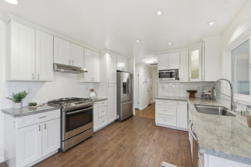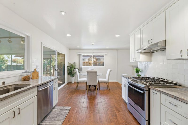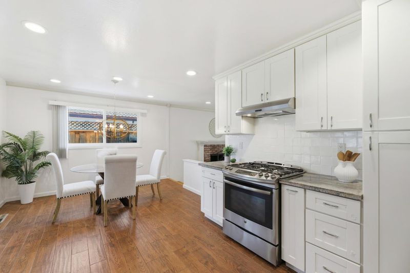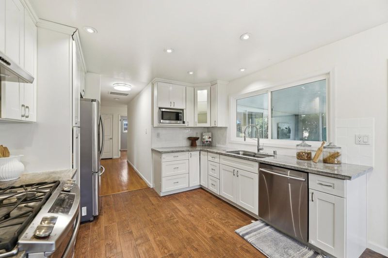 Move-in ready Cambrian home offering 3 bedrooms, 2 bathrooms, 1,275 sq ft of living space on a 6,120 sq ft lot. Fresh flooring, refreshed paint, and beautifully refreshed hardwood floors create a clean and inviting feel throughout. The bright living room features a classic brick fireplace, while the newer kitchen is updated with white shaker cabinetry, stone countertops, stainless steel appliances, recessed lighting, and a functional layout that opens to the dining area. Large sliding glass doors lead to an expansive sunroom, providing additional space for relaxing, entertaining, or enjoying indoor-outdoor living. Both bathrooms have been updated with a fresh, bright look. The backyard offers a serene setting with mature landscaping, lawn space, and a private patio area ideal for outdoor enjoyment. Additional features include dual pane windows and an attached 2-car garage. Located in a desirable Cambrian neighborhood with highly rated schools.