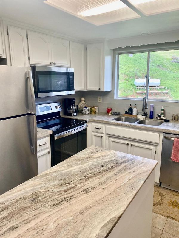- 220 Volt Outlet, Countertop - Granite, Dishwasher, Exhaust Fan, Freezer, Garbage Disposal, Hood Over Range, Ice Maker, Island, Microwave, Oven - Gas, Oven Range, Pantry, Refrigerator