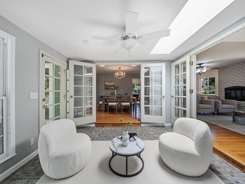Located near top-rated award winning Saratoga schools, charming downtown shops and dining, and major tech hubs, this home offers both serenity, accessibility, safe and friendly neighborhood with a neighborhood watch program. Inside, a light-filled floor plan welcomes you with spacious living areas with elegant French doors/windows. A standout feature is the bright and inviting sunroom, an ideal space to relax with morning coffee, enjoy garden views, or create a peaceful reading or hobby retreat filled with natural light. Step outside to a private backyard oasis featuring water conservation landscaping and your own fruit trees. Experience nature from your patio; this yard is a haven for hummingbirds and diverse birdlife, providing a vibrant soundtrack to your morning routine. The extended porch is ideal for entertaining or unwinding in a tranquil, natural setting. The home offers a versatile bonus space above the garage, providing incredible flexibility for today's lifestyle. Whether used as a home office, guest suite, fitness room, or creative studio, this additional area adds valuable square footage and endless possibilities. It is a rare opportunity to own a home with unique, flexible living spaces and distinctive outdoor charm in one of Saratoga's premier neighborhoods.