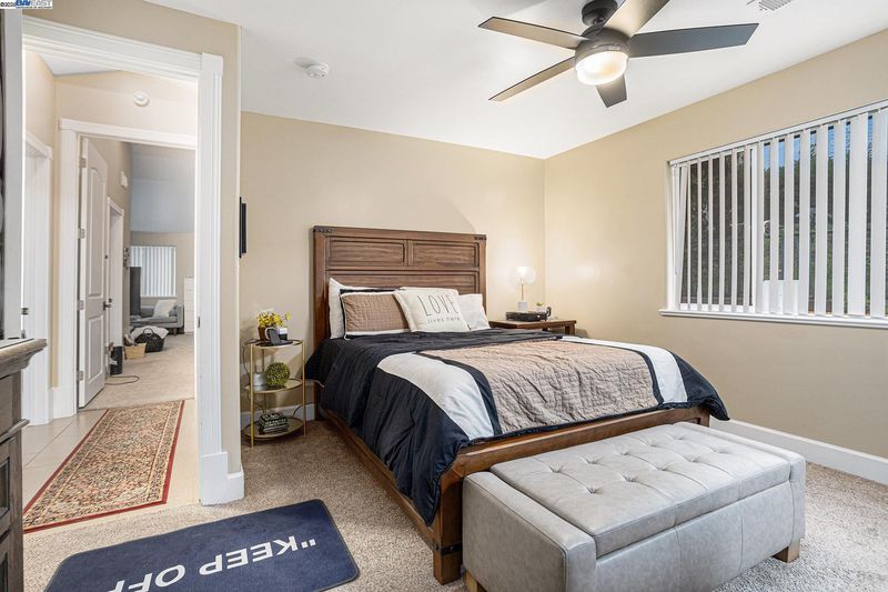 Welcome to this beautifully upgraded and expanded 3-bedroom, 3-bath Woodland Estates home, set on a generous 12,900 sq. ft. lot with approximately 2,200 sq. ft. of living space. This is a rare opportunity to own a property offering breathtaking panoramic views of the Bay, San Francisco, and the Bay Bridge. The open-concept floor plan is ideal for entertaining and features a gourmet kitchen with double refrigerator, high-end 48” stainless gas range, granite countertops, walk-in pantry, and stylish custom cabinetry. The spacious living area boasts vaulted open-beam ceilings and a decorative electric fireplace that adds warmth and character. The luxurious primary suite includes a walk-in closet and a beautifully appointed private bathroom. A second master bedroom provides added flexibility, while the third bedroom offers abundant natural light. A separate laundry room adds convenience. Energy-efficient upgrades include an owned 26-panel solar system. The detached, oversized 2-car garage features overhead storage and an electric car charger. Outdoors, you’ll find a synthetic front lawn and a low-maintenance backyard with pavers—perfect for gatherings while enjoying the afternoon sunset. Located in Woodland Estates, nestled among the oak trees and canyons of the Hayward Hills.