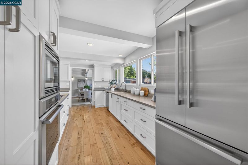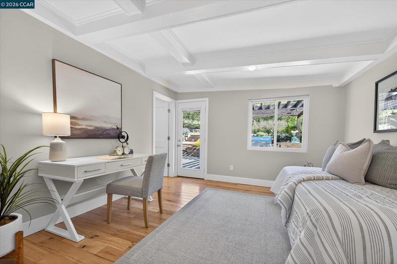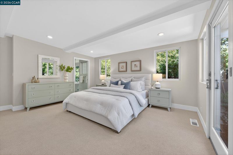 Single-level mid-century modern home offers style, comfort, and a prime Orinda location moments from Del Rey Elementary, Orinda Intermediate School and Miramonte High School. Featuring 4 bedrooms, 2 full and 2 half baths, and 2,348 sq ft. Hickory floors span the main living areas and one bedroom, with new carpet in the others. The spacious primary suite includes a walk-in closet and spa-like bath with a Victoria + Albert soaking tub, dual-head shower, heated tile floors, and double vanity. California Closets in three bedrooms; bathrooms feature Caesarstone counters. Family room with stunning fireplace, built-ins, and hardwired Bose soundbar. Kitchen offers Caesarstone counters, island seating, stainless steel appliances including French door refrigerator, double ovens, new gas cooktop, wine fridge, and pet station. Backyard by Garden Lights features sport court, raised vegetable beds, and outdoor kitchen with Neolith counters, wood burning pizza oven, BBQ, fridge, fire pit, and pergola. Owned solar.