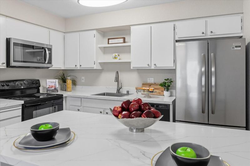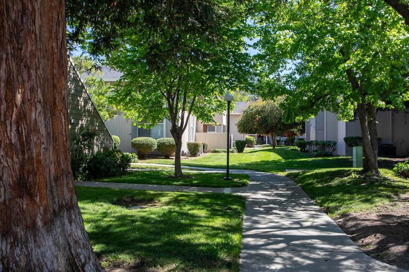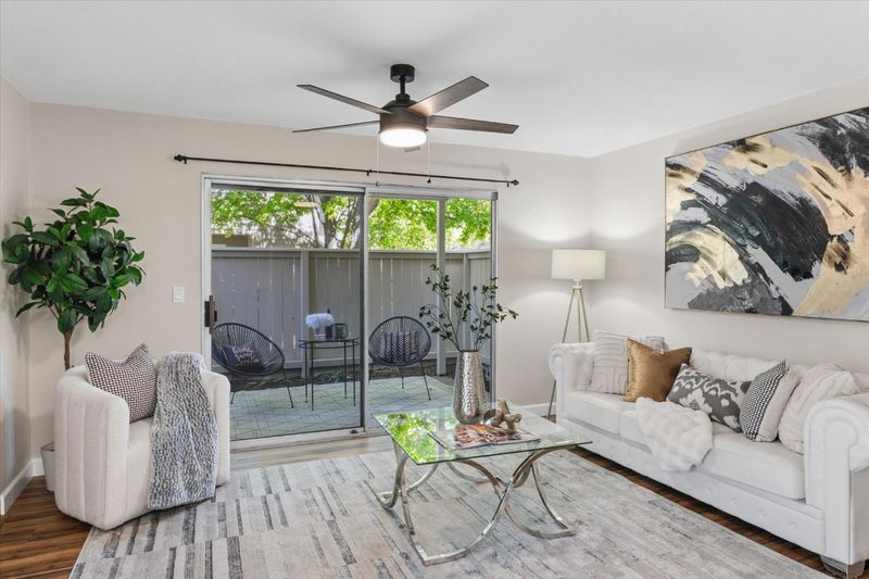 Quiet inside-corner unit in Sean Circle, a well-maintained Blossom Valley community, offers garden views and a private covered patio. Wood-burning fireplace with updated tile surround and hearth anchors the living room, where beautiful luxury vinyl tile and fresh paint run throughout. Ceiling fans in both bedrooms and the living room. Bathroom features brand-new vanity, countertop, and sink. Kitchen includes a brand-new French door refrigerator with ice maker, new countertops, dishwasher, garbage disposal, and range with microwave vent hood. Full-size washer and dryer inside the unit. North-facing exposure keeps the unit naturally cool; portable air conditioner included. HOA covers water, hot water heating, and garbage collection and maintains the pool, hot tub, and beautifully landscaped grounds. Two assigned parking spaces, one covered with an adjacent storage unit. Fenced community limits cut-through traffic. Minutes to Coy Park, Westfield Oakridge Mall, Martial Cottle Park, light rail, and Highways 85, 87, and 101.
